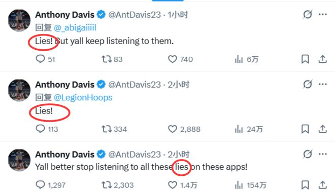 此前,名记Shams率先报道,戴维斯预计将接受左手韧带修复手术,缺席赛场数月。戴维斯对Shams的报道予以否认,并通过社交媒体进行反驳。“大家最好别再相信这些平台上的谎言了。”戴维斯在社媒上写道,随后又在多条援引这一突发新闻的帖子下回复“谎言”二字。在今天将前往洛杉矶与手部专家会面后,浓眉确定无需接受手术。Shams随后也修正了自己的报道,不过未来六周,浓眉是肯定无法出场了。
