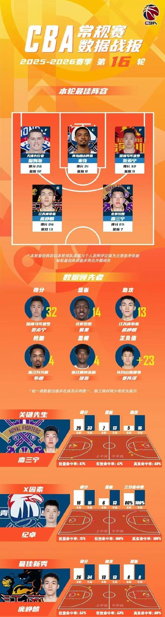 CBA官宣常规赛第16轮最佳阵容,贺希宁32+9制胜两罚创赛季新高,帮助深圳双杀辽宁;贺希宁25+7关键绝杀,帮助北控1分优势险胜广东;外加庞峥麟、米奇与詹姆斯入选。