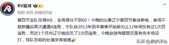 第四节全队仅得4分,全场得分不到60!今晚的比赛辽宁第四节集体断电,客场不敌新疆后再次遭遇4连败,宁队自2013年到本赛季开始前为止12年间仅有过1次四连败,而近1个月内辽宁就经历了2次四连败,今晚赵继伟腿部还是有伤本场没打,球队目前的处境非常艰难。