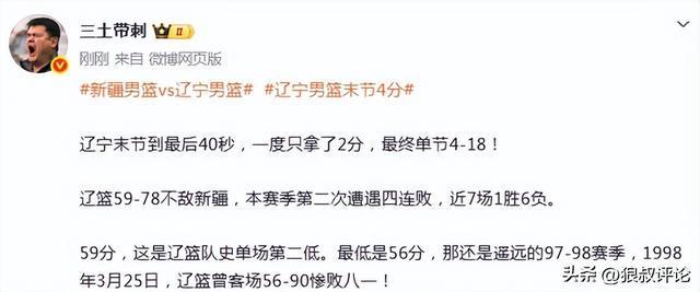 辽篮59-78不敌新疆,本赛季第二次遭遇四连败,近7场1胜6负。
