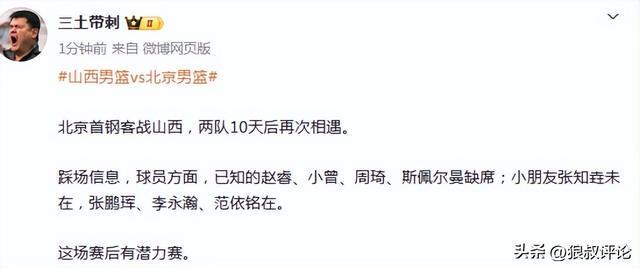 根据现场媒体报道,赵睿、小曾、周琦、斯佩尔曼缺席。这就意味着北京的综合实力方面,并没有太大的优势。