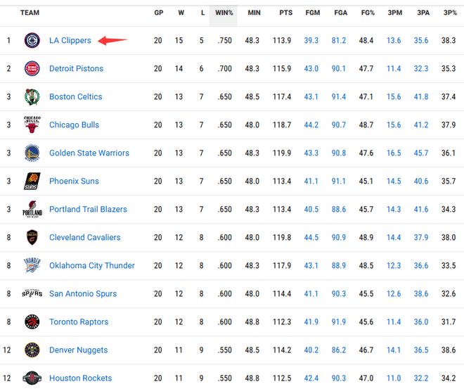 近20场胜率排名:快船居首勇士开拓者并列第3 雷霆第8火箭第12