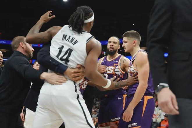北京时间1月28日,NBA常规赛:太阳主场106-102险胜篮网。第四节还剩1分18秒,双方爆发冲突:多人倒地争抢地板球,篮网新秀杰明将狄龙-布鲁克斯推倒。罗伊斯-奥尼尔推了一把杰明,曼恩又上前推奥尼尔,小波特也加入战斗。