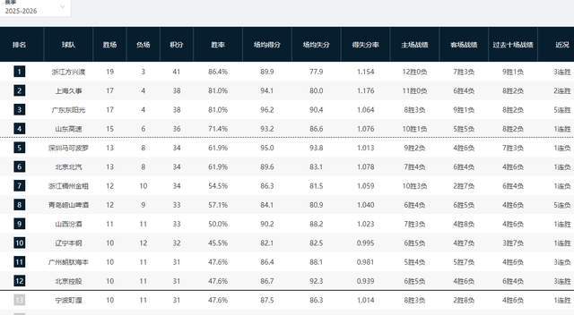 CBA常规赛已经打到第22轮,在本轮率先结束四场对决中,并没有爆冷场次产生,浙江广厦68-58击败浙江男篮稳居第一,山东男篮83-80力克广州男篮杀进四强,辽宁男篮大胜天津止住颓势,山西男篮客场大胜吉林男篮。从目前积分榜的格局来看,排名前四的球队逐渐与身后球队拉开差距,浙江广厦以19胜3负的成绩稳居第一,山东男篮也是以15胜6负的战绩杀进前四,上海男篮和广东男篮则是在力争第二,辽宁男篮击败天津男篮之后终于重返季后赛区。