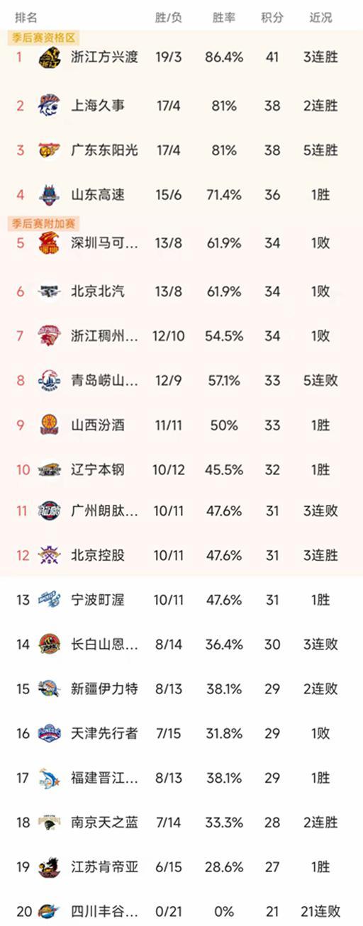 CBA常规赛第22轮结束了4场比赛,最新积分榜如下!