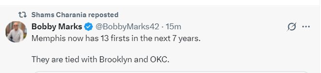 ESPN薪资结构专家鲍比-马克斯表示,在这笔交易后灰熊未来七年已经手握13个首轮签,首轮签的数量跟雷霆、篮网一样同为联盟最多。