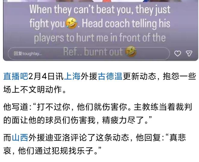 另一方面,涉及本次事件的上海队外援古德温,近期一直处于舆论的焦点,此前他曾在社交媒体上发表过针对广东队教练的言论,而本场比赛他再次在关键时刻成为影响比赛走势的人物。