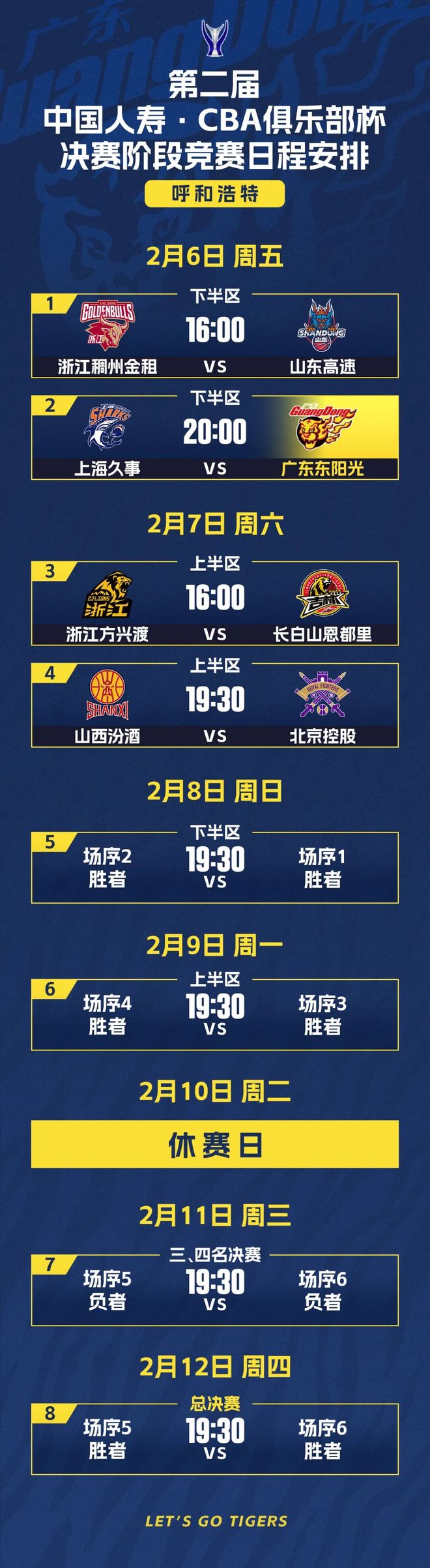 决赛阶段采用单败淘汰制,8支球队将展开激烈争夺,按排名办法最终产生本届杯赛所有名次。广东东阳光1/4决赛对手为上海久事。在胡明轩、徐杰和焦泊乔入选新一期中国男篮集训名单的情况下,广东队此次将以年轻阵容征战。希望小将们无惧困难,放手一搏!一起为华南虎加油!
