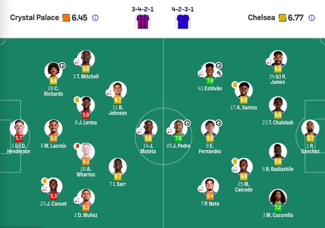 水晶宫首发:1-亨德森、23-坎沃特(65'24-索萨)、2-穆尼奥斯(76'34-里亚德)、3-米切尔(65'10-皮诺 )、5-拉克鲁瓦、26-理查兹、8-莱尔马、20-沃顿、7-萨尔、11-约翰逊(76'19-休斯)、14-马特塔(85'12-乌切)