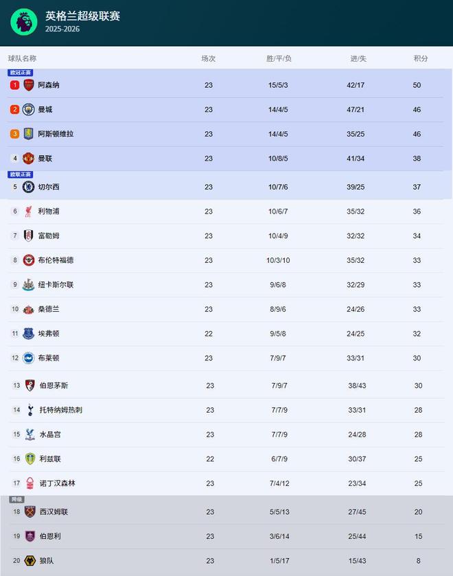 英超最新积分榜出炉