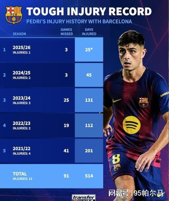 从另一个角度说,佩德里还没彻底重视自己的伤病史。自2021-22赛季以来,佩德里先后受伤13次,因伤缺阵了579天,缺席了球队的104场比赛,这是一组触目惊心的数字。