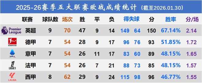 在胜场、胜率、进球、失球、场均得分方面,英超球队毫无悬念地一马当先,这一点其实大家早有预期。不过垫底的居然是西甲,这应该出乎很多人的意料。反而是印象中唯唯诺诺毫无亮点的意甲球队,竟然还能排在第三。