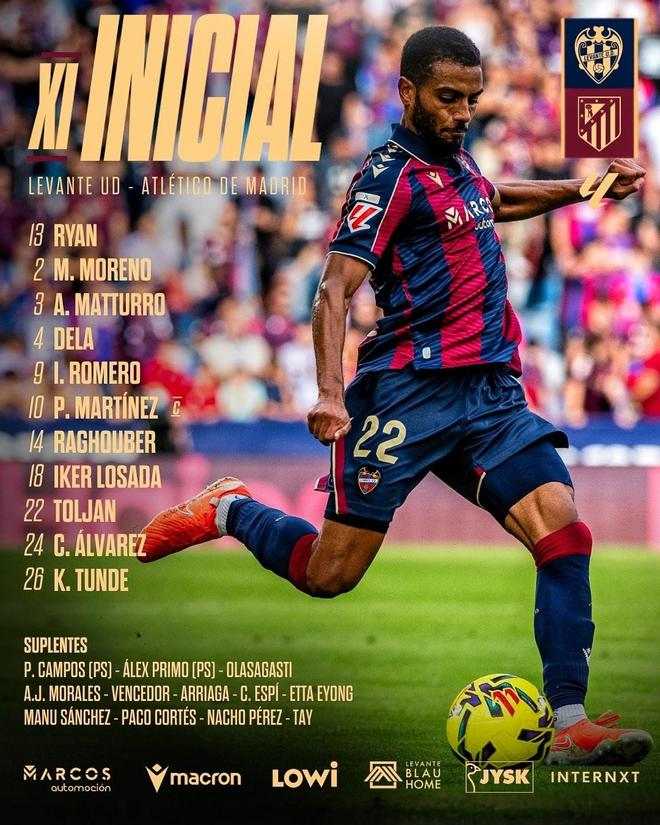 马竞客战莱万特:瑟洛特、阿尔马达首发,巴里奥斯出战