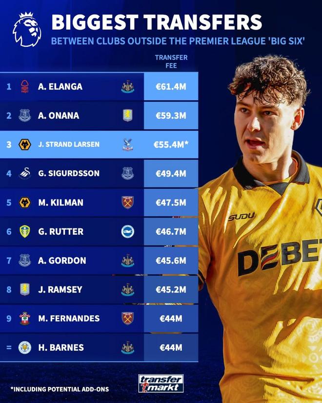 北京时间2月3日,德转统计出了英超历史除BIG6以外最贵的10笔交易,纽卡斯尔联去年夏天6140万欧元从诺丁汉森林引进埃兰加排名第一,今年冬窗水晶宫转会费加奖金总价5540万欧元从狼队引进尤尔根-拉森排名第三。