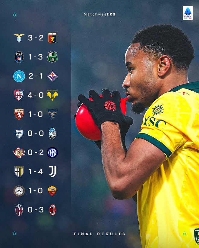 意甲第23轮综述:米兰三球完胜仍落后国米5分,尤文超罗马进前四