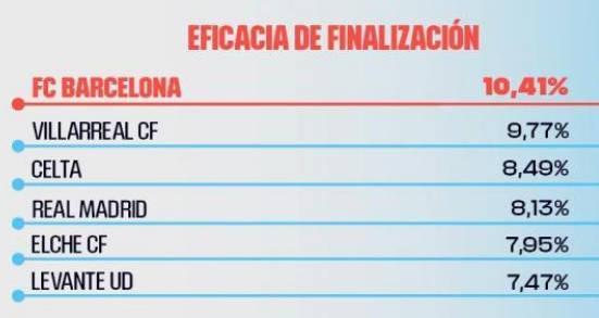 根据西甲官方列出的统计数据,巴萨是本赛季西甲射门转化率最高的球队,也是控球涉及人数、创造威胁次数最多,成功阻止对手射门比例最高的球队。