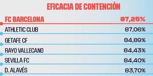 巴萨在防守中成功阻止对手完成射门的比例为87.25%,领先于毕尔巴鄂竞技(87.06%)和赫塔费(84.89%),成为阻止对手进攻的最佳球队。