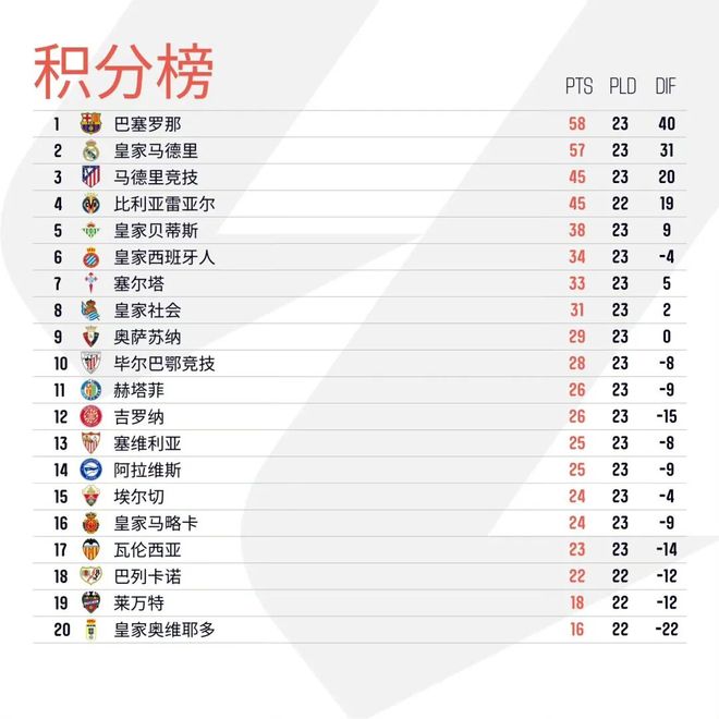 保级军团方面,本轮联赛倒数第三巴列卡诺对阵“副班长”皇家奥维耶多的保级大战推迟进行,就此降级区三支球队均只完赛22场,其中巴列卡诺积22分,莱万特积18分,皇家奥维耶多积16分。降级区外的瓦伦西亚同样输球,在多赛一场的情况下,只领先巴列卡诺1分,联赛下半区的球队多数仍存在降级风险。