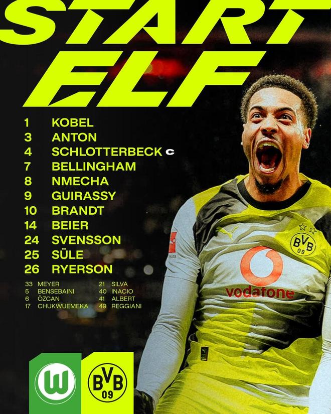 多特客战沃尔夫斯堡:吉拉西、拜尔、布兰特、聚勒首发