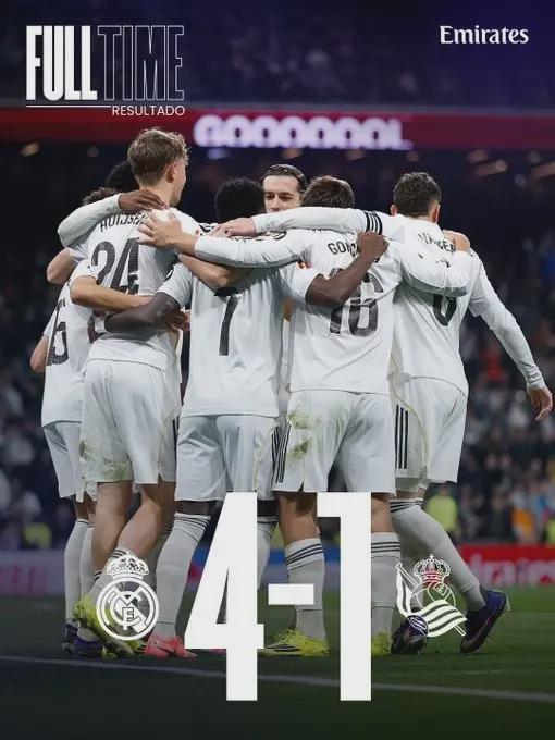 4-1!西甲第24轮,皇马在伯纳乌轻松拿下皇家社会,先赛一场以60分登顶,豪取联赛8连胜。阿诺德的助攻、巴尔韦德的远射、维尼修斯的梅开二度,一切看起来都那么完美。