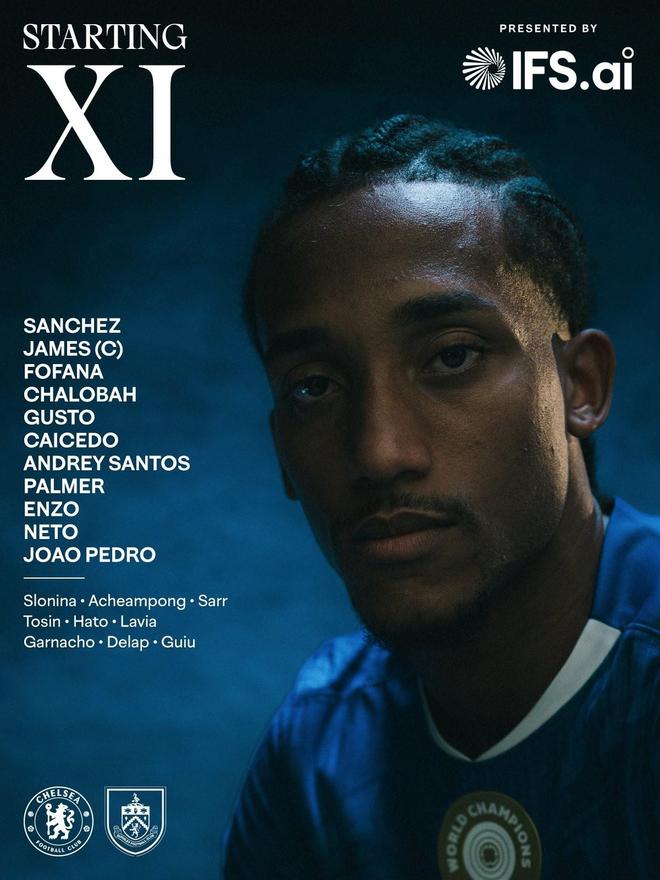 切尔西首发:1-罗伯特-桑切斯、24-里斯-詹姆斯、29-韦斯利-福法纳、23-特雷沃-查洛巴、27-古斯托、25-莫伊塞斯-凯塞多、17-安德雷-桑托斯、10-帕尔默、8-恩佐-费尔南德斯、7-佩德罗-内托、20-若昂-佩德罗