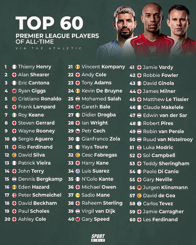 TA评英超历史60大球星:亨利居首,C罗第5,萨拉赫第25