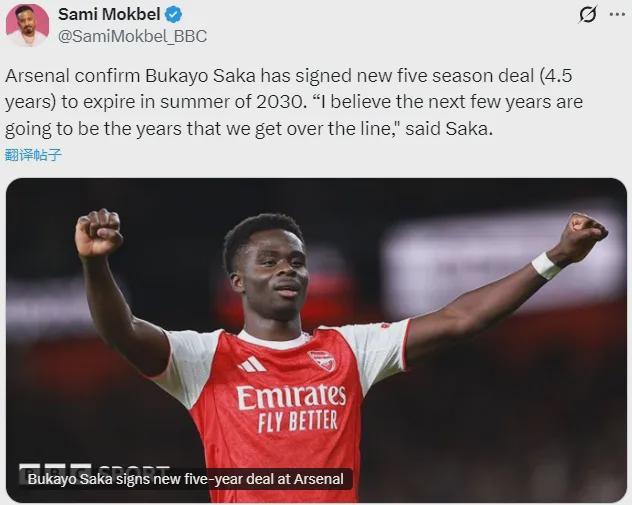 根据BBC记者SM的说法,萨卡的新合同其实是2030年夏天到期(4.5年)。