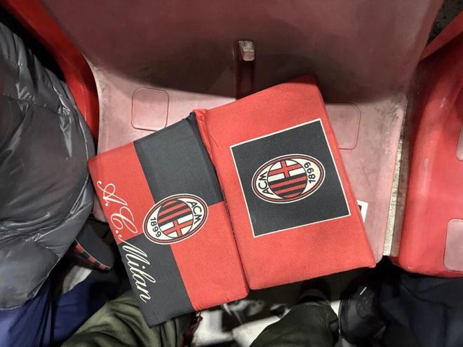 我左右两边的球迷体型都偏大,我被夹在中间,与他们一起组成了一个“三明治”。这导致我拍摄照片和视频都变得十足费劲,但也很温暖。被两个壮汉固定在塑料座椅上,屁股需要经受比较大的考验。我旁边的那位球迷就比较有经验了,专门带了一个带有AC米兰队徽的座垫。