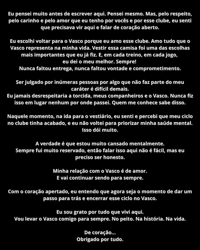 “在深思熟虑之后,我决定坦诚地表达我的感受。”库蒂尼奥写道,“我选择回到瓦斯科达伽马是因为我对俱乐部的热爱。我热爱这里的一切,甚至超过了我过去的一切。在每一次训练和每一场比赛中,我都全力以赴。我从未缺乏奉献精神、意愿和责任感。”